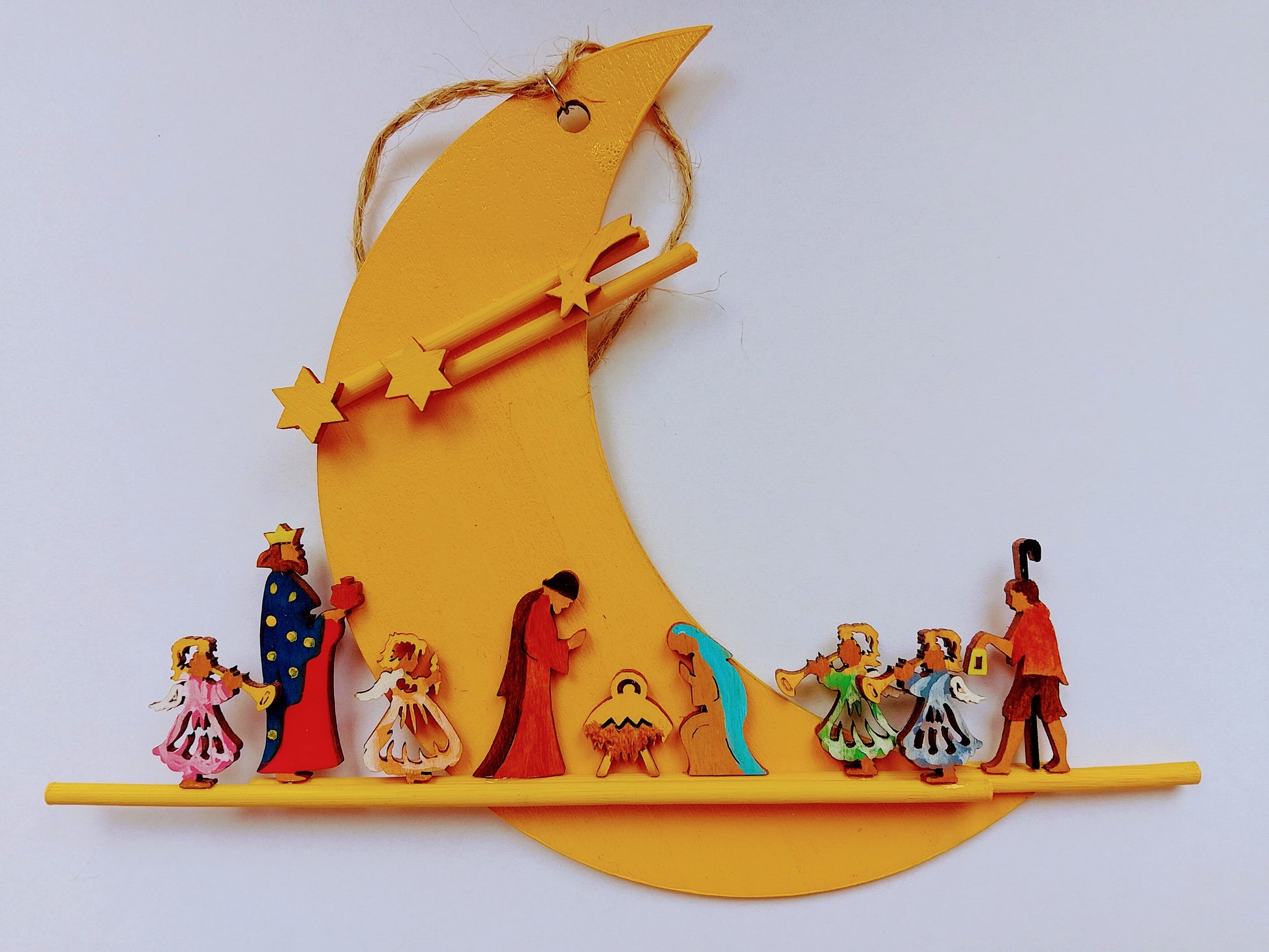Detailreich gestalteter Halbmond mit der Szene der Geburt Christi. Diese kunstvolle Holzarbeit zeigt die Hirten und drei Heilige, die das Jesuskind im Stall zu Bethlehem besuchen. Ein traditionelles Weihnachtsstück, das die heilige Nacht in zeitloser Handwerkskunst einfängt und Ihre festliche Dekoration bereichert.
